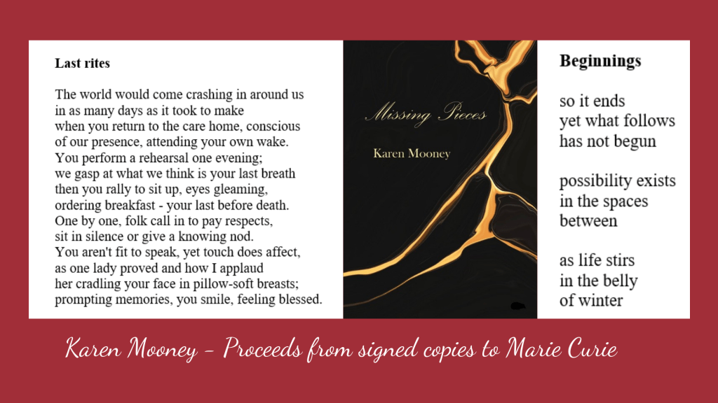 Fancy a signed copy and helping Marie Curie – a little taster of what you can expect from Missing Pieces. This is one of the most poignant poetry pamphlets I have read. Have your tissues ready.