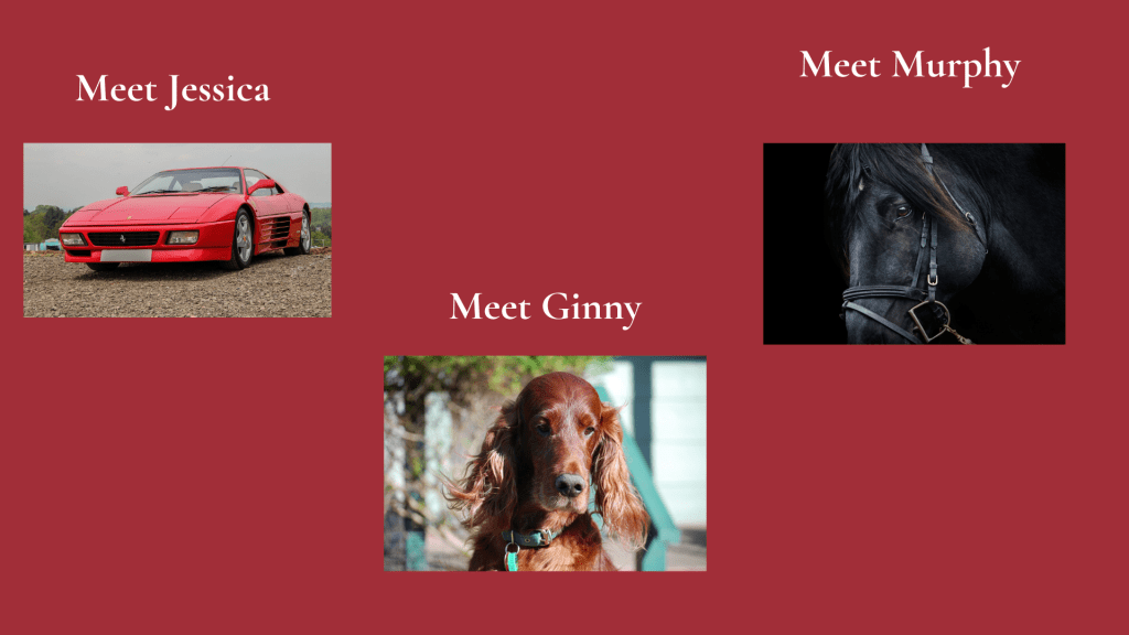 Over the next week before release I shall introduce you to some new characters in The Granville Legacy. Today I’d like to introduce you to Jessica – George’s red Ferrari – Ginny – Jack’s red setter – Murphy – George’s stallion.