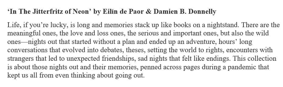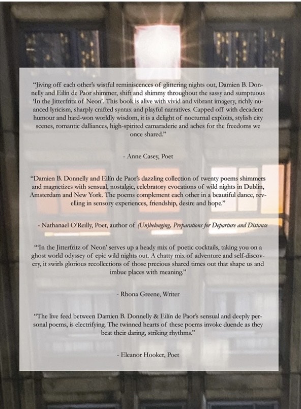 Something a little different today on Patricia’s Pen, in so much as rather than have one guest poet, I have two. Co-authors, Eilín de Paor and Damien B Donnelly, of In the Jitterfritz of Neon have come along to chat about their new release. Firstly, without further ado, it’s over to Eilín.