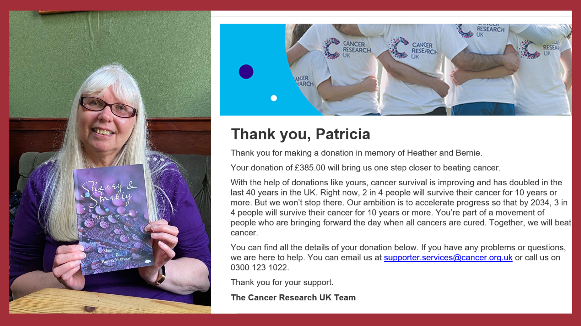 Cancer touches us all in one form or another and it is for this reason that Maureen Cullen and I decided to use our sale proceeds from Sherry & Sparkly (published by The Hedgehog Poetry Press) to donate to Cancer Research UK. We started fundraising in January 2022 and to date we have donated £385 to the charity in memory of our sisters, Heather and Bernie, who lost their battle to cancer.
