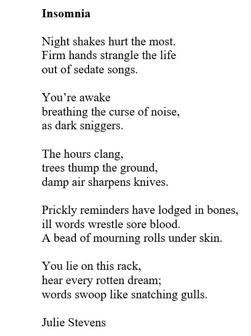 Julie Stevens writes poems that cover many themes, but often engages with the problems of disability. She is widely published in places such as Ink Sweat & Tears, Broken Sleep Books, The Honest Ulsterman, Strix and Indigo Dreams Publishing. She has 3 published pamphlets: Step into the Dark (July 2023), a Stickleback Balancing Act (June 2021) both with The Hedgehog Poetry Press and a chapbook Quicksand (Dreich, Sept 2020).