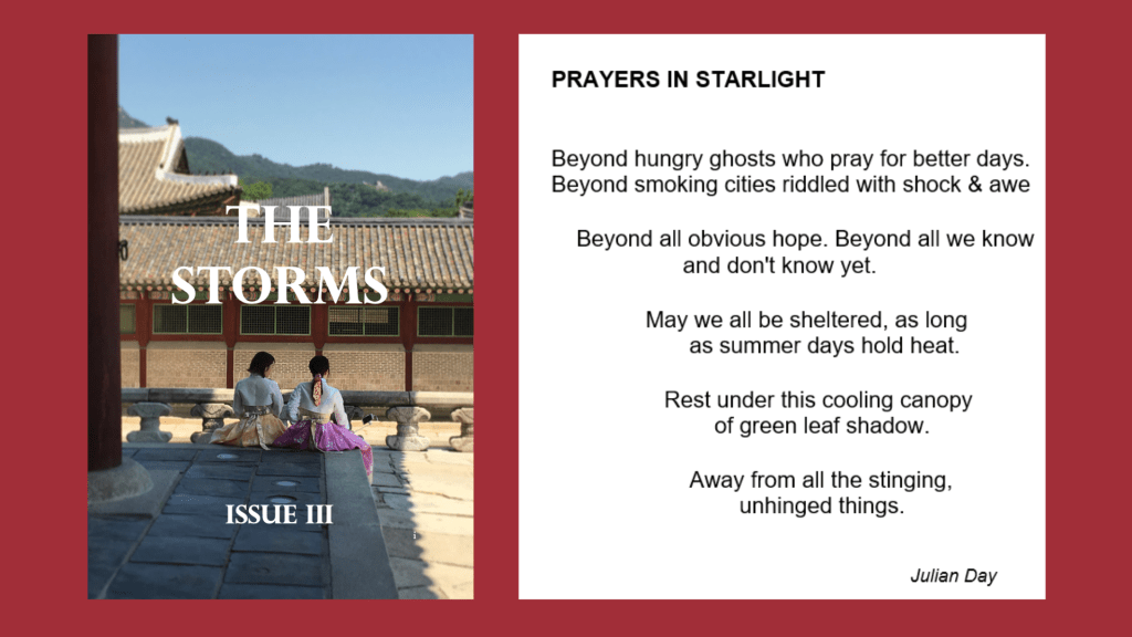 Julian Day is an emergent poet & writer based in Surrey. He has been a featured poet by Blackbough Poetry and had work published by them in two recent anthologies. Julian has been nominated for a Best Of The Net by Blackbough. His poetry has also been published in The Storms journal and appeared three times, reading his poems, on Eat The Storms podcast.