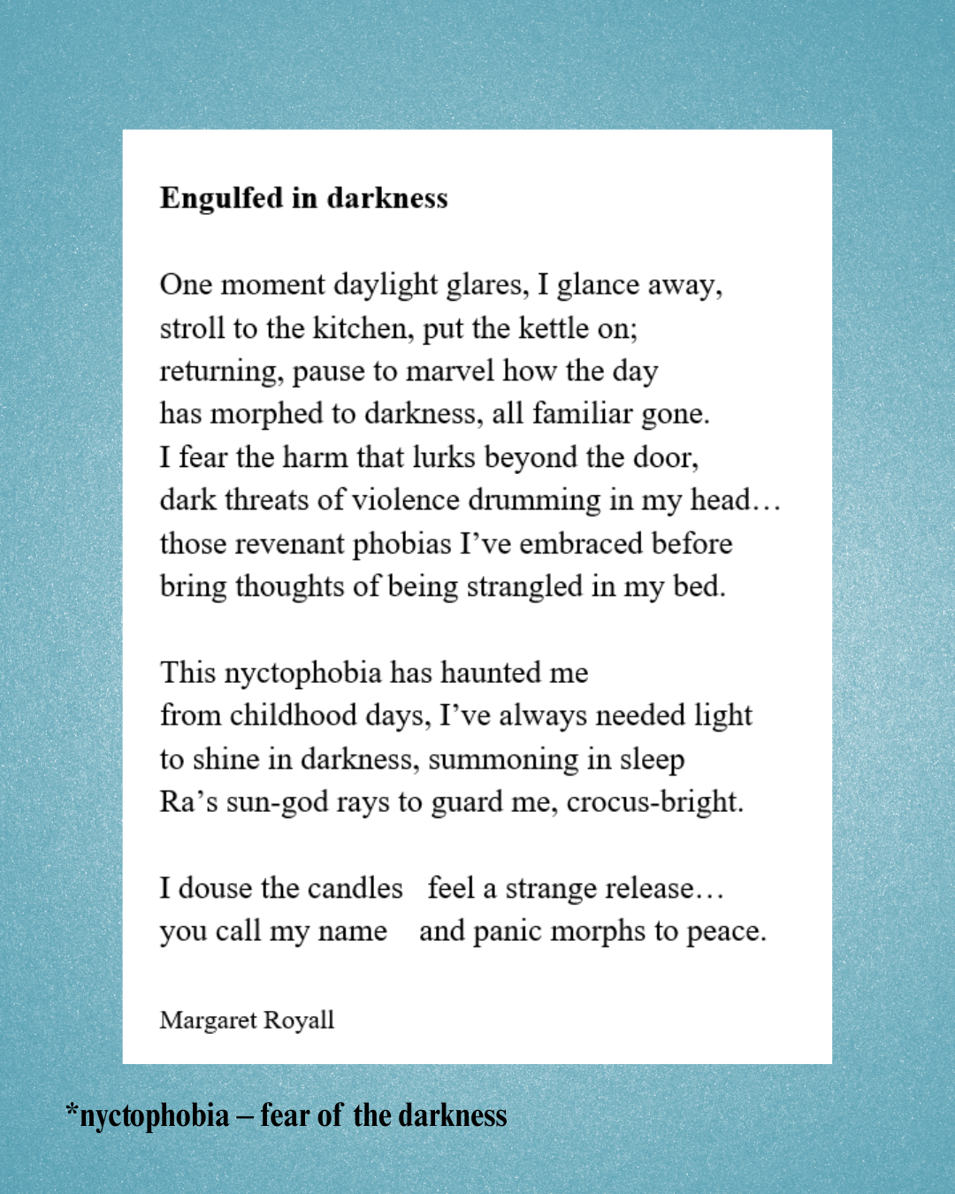 I have chosen the sonnet form in many poems, having always enjoyed writing in form and particularly using sonnets. Recently I took a course with distinguished poet Anna Saunders on writing sonnets for contemporary times, which I greatly enjoyed. This then naturally followed through into my latest work. It has been a huge challenge to write in this concise poetic form that uses rhyme, but to do it in a non-intrusive way. I hope that in some small way I have succeeded and brought the reader with me on my journey. My wish is to demonstrate that despite life throwing us curve balls, with patient determination we can find solutions, coping strategies that enable us to emerge as stronger, more hopeful and better human-beings.